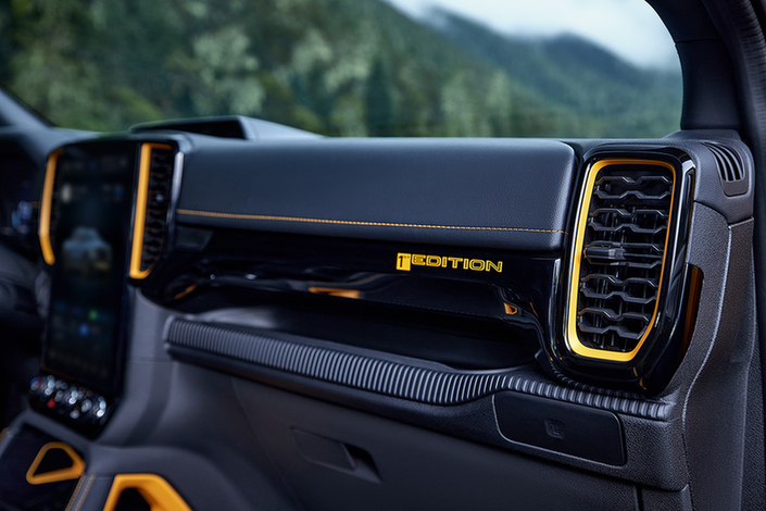 内饰方面,福特Ranger 1stEdition首发版也增加了丰富的专属元素:橘黄色的缝线以及“1st Edition”镭射专属标识。车内12.3英寸仪表盘+12.8英寸中控双大屏可以提供丰富、清晰、醒目的驾驶及娱乐信息。超大尺寸的全景天窗可以大幅度提升车内空间的通透感。驾驶舱前排顶部控制台增加了预布线的六组改装预留开关模块,用户能够轻松从驾驶舱内部控制外接设备。