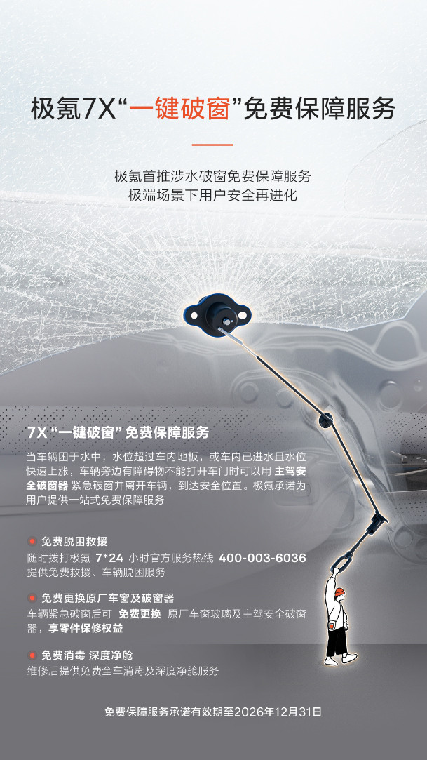 免费保障服务承诺自发布之日起有效期至2026年12月31日,覆盖所有极氪7X车型。此次一键破窗保障服务的推出,是极氪在安全领域的又一重要举措。未来,极氪7X将全球首发一键破窗技术对所有行业全面开放,将持续以用户为中心,推动智能电动汽车安全标准的不断升级,打造更加安心的出行体验。