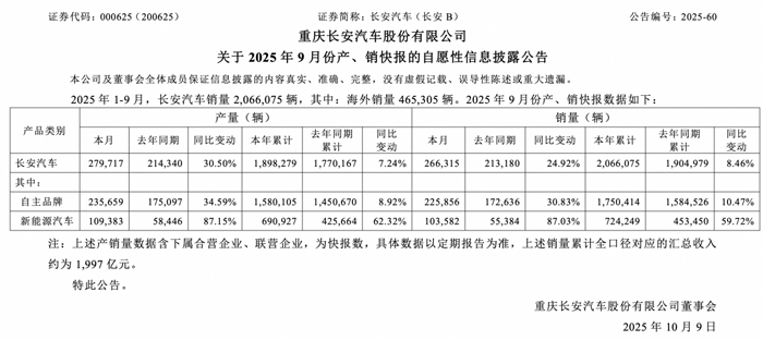 当前,中国汽车产业正在加速由规模扩张阶段迈向高质量发展阶段,长安汽车坚持“稳健勇进”的战略基调。前三季度整车销量达206.6万辆,同比增长8.46%,其中新能源汽车销量72.4万辆,同比增长59.72%;海外销量46.5万辆,同比增长10.7%,均创历史新高,展现出强劲攀升势头。
