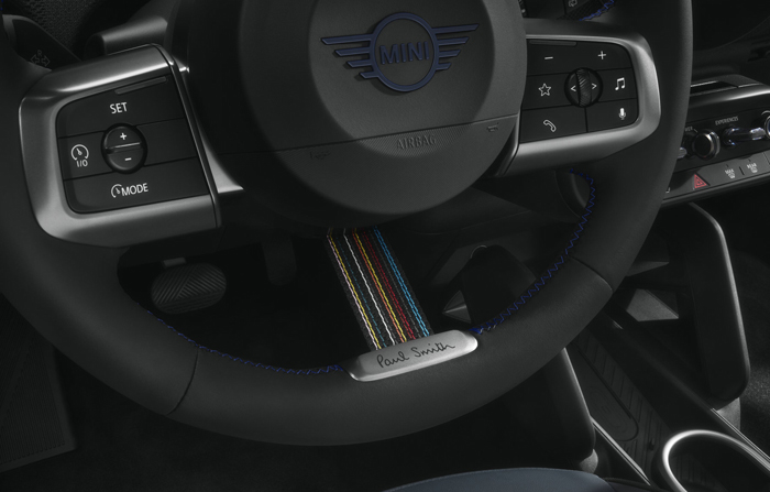 除了极具风格的配色,MINI PAUL SMITH设计师款的外观还有更多低调而考究的细节。在诺丁汉绿车顶上,作为其核心设计元素的Paul Smith经典条纹,如点睛之笔恰到好处地装饰在驾驶员一侧;另一种亮黑色车顶版本则饰以粗细不一、兼具磨砂与光泽质感的Paul Smith暗调条纹,体现出低调的质感;MINI COOPER CABRIO PAUL SMITH设计师款则标配黑色软顶。所有车型均配备18英寸幽影黑铝合金轮毂,采用碳钢灰色调的深色涂层。诺丁汉绿的轮毂盖上标有Paul Smith手写签名,车辆前后专属炭蓝色MINI标识与后备厢把手上的Paul Smith签名上下错落,一同道明了车辆设计背后的创意灵魂。