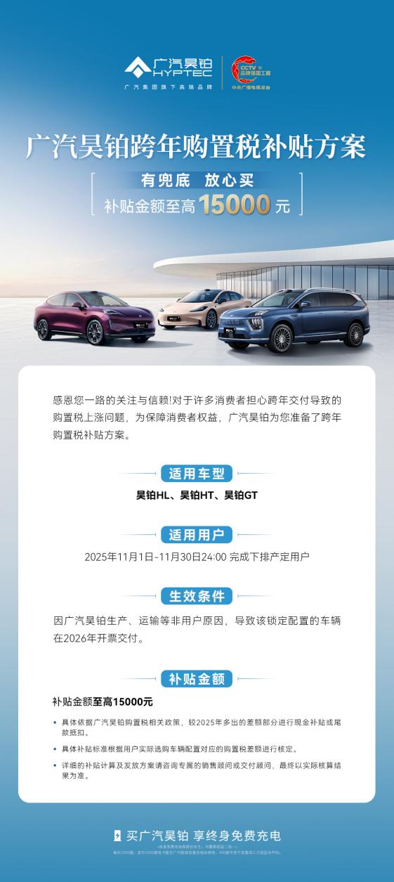 针对可能因交付周期导致的跨年购置税问题,广汽昊铂特别推出跨年购置税补贴方案,提供至高15000元的购置税差额补贴,真正做到“有兜底,放心买”。
