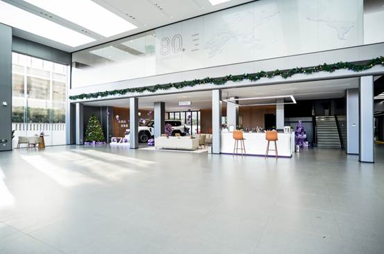 体验中心外立面采用极简大气的设计语言,搭配银灰色蜂窝铝板与超白钢化玻璃幕墙,既彰显硬派越野的力量感,又透过多元材质的碰撞营造现代通透的视觉体验,与纵横“从容自信,追求极致,勇于探索,无畏坚韧”的精神高度契合。