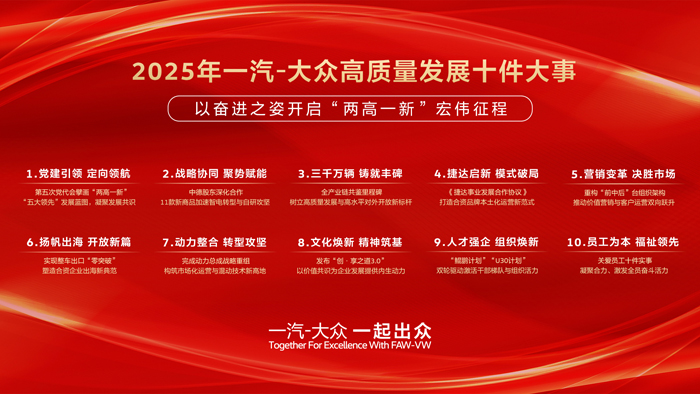 回望2025年,一汽-大众秉持产业报国初心,勇担央企合资企业使命,实现了稳健经营与高质量发展。站在“十四五”与“十五五”交汇的历史节点,一汽-大众以“十件大事”为笔,擘画了面向未来的崭新蓝图,为企业长远发展筑牢了坚定基石。