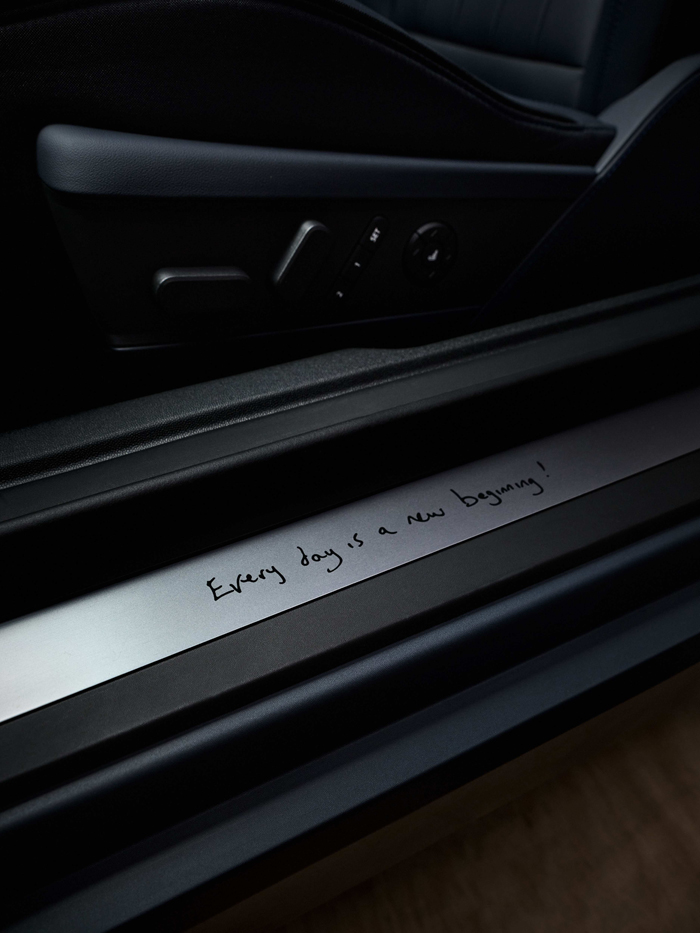 更可贵之处是,Paul Smith用充满智慧的乐观和幽默,为这款车注入了满满的"人情味"。解锁车门时地面投射出的手写体"Hello"问候、脚垫上寓意幸运的手绘兔子,都为车主带来不可复制的暖心慰藉。为了保留这份有温度的祝福,Paul坚持使用手写体,比如有设计师签名的轮毂盖、写有"Every day is a new beginning!"的迎宾踏板,这类非标准化的零部件对工业化生产带来了巨大的挑战。MINI工程师为此开发了专属零部件,按照宝马集团统一的质量标准进行测试、验证和生产。这些原厂零部件都有独立编号,即使未来这款车型停产,零部件也能持续供应至少12年。