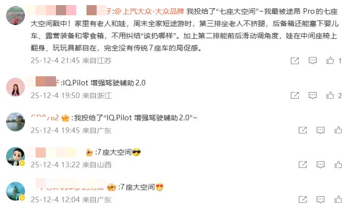 在评选互动中,“七座大空间”与“IQ.Pilot增强驾驶辅助2.0”成为网友投票关注的两大焦点。不少用户留言支持途昂Pro的大空间:“家里有老人和小孩,周末全家出游时,第三排坐老人不挤腿,后备箱还能放下婴儿车、露营装备,不用再纠结该扔哪样。”同时,IQ.Pilot增强驾驶辅助系统2.0凭借“实时感知路况,人机共驾更安心”的出色体验,获得大量网友的选择,成为高票人气配置之一。真实用户的声音,印证了途昂Pro在实用与科技感层面的双重吸引力。