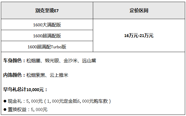 别克至境E7公布三款车型配置,定价区间16万-21万元,即日起至4月21日(含)前下定可享10,000元早鸟礼