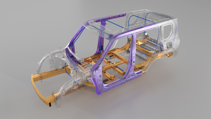 基于此,广汽创新性地提出了“嵌入式大梁+多元环笼”的车身架构。该技术灵感来源于中国古代轿子的坚固轿架,将传统非承载式车身的独立大梁,创新性地嵌入承载式车身主体框架中,真正实现了“车身即车架,车架即车身”的一体融合,该设计打破了“强悍越野必须依赖独立大梁”的行业传统认知。