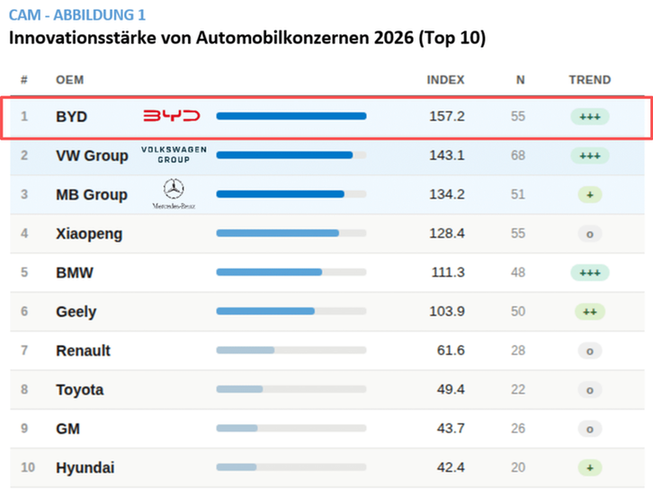 德国汽车管理中心CAM的“汽车创新研究”自2005年启动以来,榜首位置二十年间始终在奔驰、大众、宝马三家德系巨头间轮换。此次比亚迪登顶,是该榜单创立以来,中国企业首次登顶全球冠军。